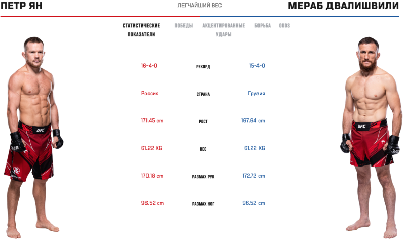 11 марта в Лас-Вегасе, США состоится турнир UFC Fight Night: Ян-Двалишвили, в главном бою которого сойдутся второй и третий номера рейтинга UFC в полулегком весе россиянин Петр Ян и грузин Мераб Двалишвили.